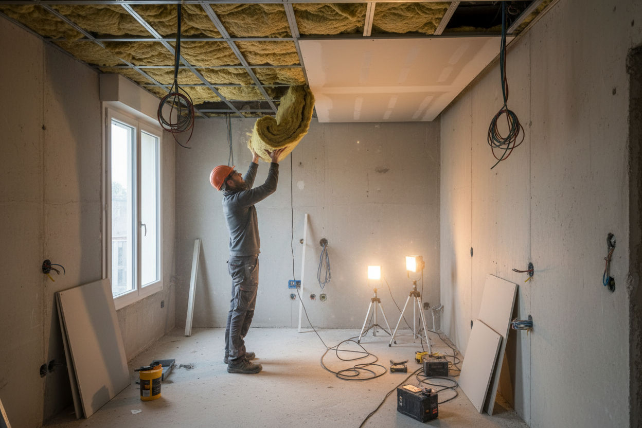 Comptez entre 50 et 80 € du m² posé, isolant et plaques de plâtre inclus. Pour un salon de 25 m² dans un appartement à Trinquetaille, ça donne un budget de 1 250 à 2 000 €. Le prix monte si on ajoute des spots encastrés ou un traitement acoustique renforcé.