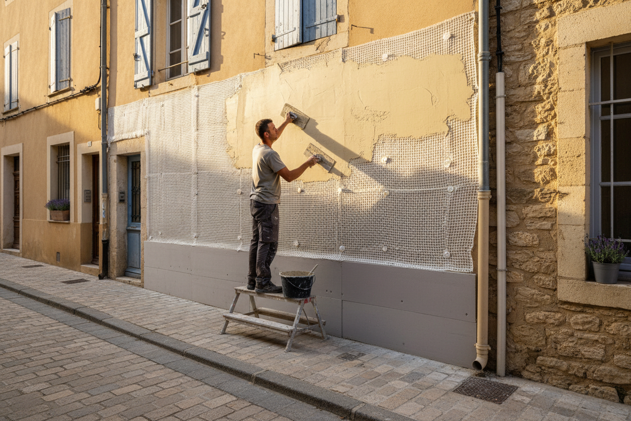 On inspecte la tenue du crépi existant, les fissures, les remontées d'humidité en pied de mur. Sur les maisons anciennes en pierre du centre d'Arles, on vérifie aussi la cohésion des joints. Un sondage au marteau permet de repérer les zones creuses. Si le support est sain, on colle directement l'isolant. Sinon, on purge et on reprend avant de poser quoi que ce soit.